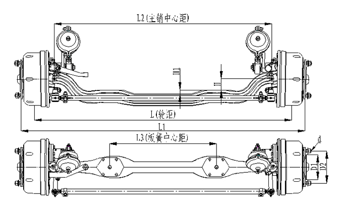 1.前軸為整體鍛造結構,采用加強設計,承載能力強;2.輪距、板簧距可靈活調整